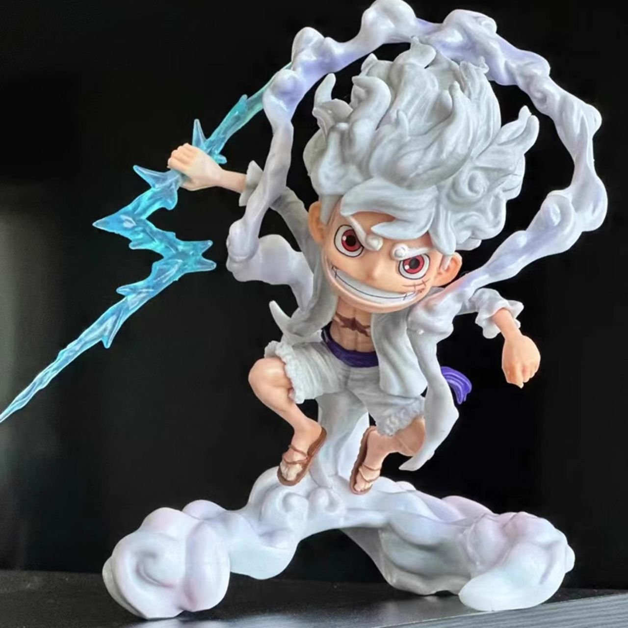 This collectible shows Luffy with his iconic white hair and a dynamic lighting aura effect, capturing the energy and excitement of his powerful transformation. Also he is posted confidently while holding a lighting bolt, standing on a detailed cloud base that adds an extra dramatic touch to the design.