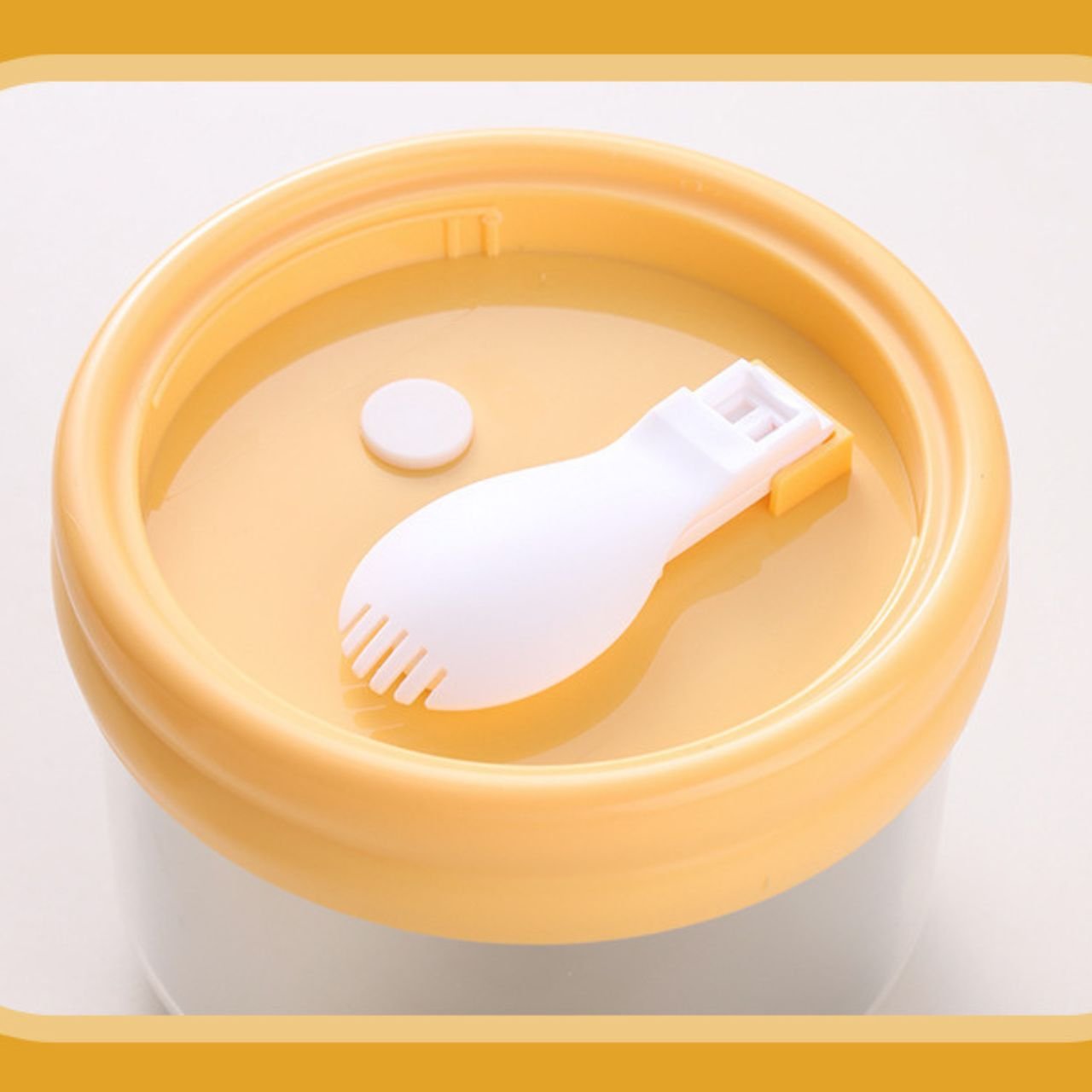 It comes with a foldable plastic spoon that fits in the lid, so you never forget your utensils. The handle is collapsible, and the round shape fits nicely in bag.